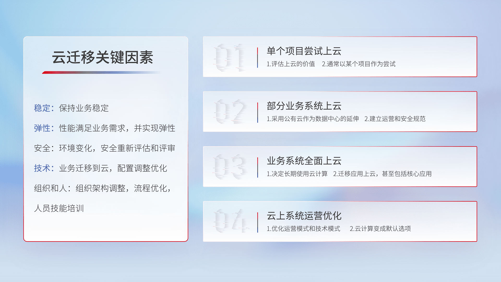 结合实际业务,,从规划设计、、、云平台选型、、、、云原生改造、、数据迁移、、集成交付,,,,迁移全过程为客户识别最佳上云路径,,做好风险识别管理,,,,设计网络架构、、身份权限、、、安全审计合规、、、、操作审计、、、、日志审计、、、监控告警策略、、多站点容灾设计等,,对云上基础设施进行整体规划,,,,提升IT治理水平,,以满足弹性、、、高可用、、、、高性能的需求。。。